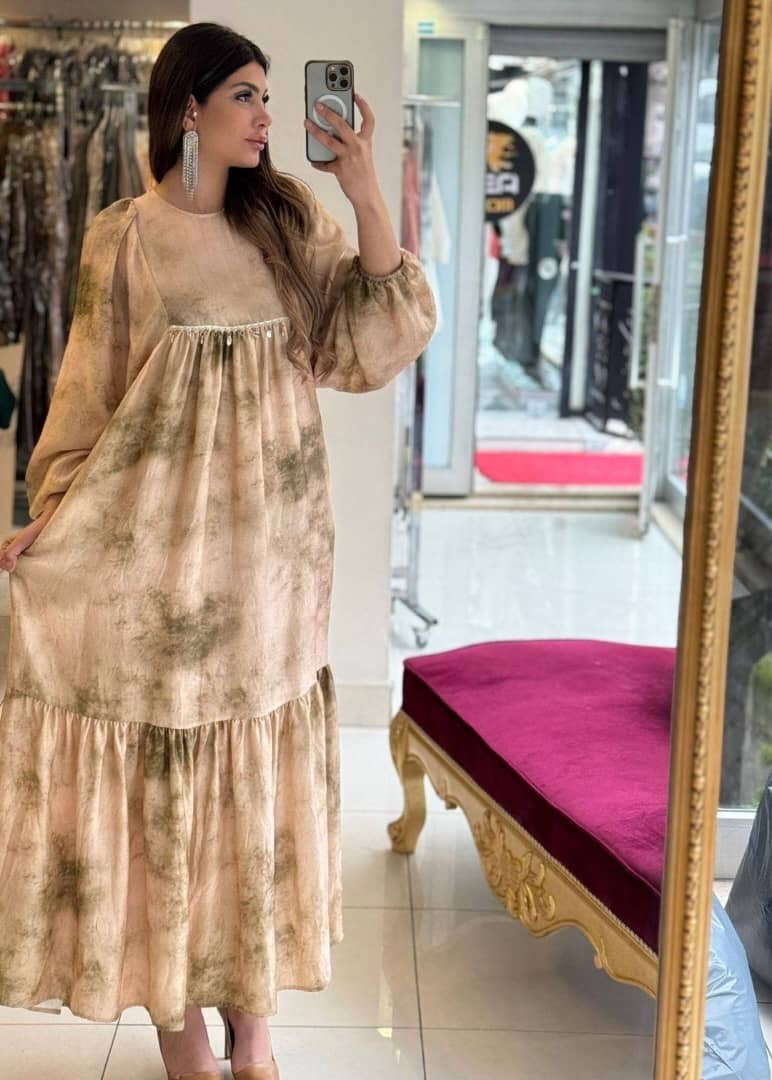 Step into effortless elegance with this beautifully designed tie-dye maxi dress. Crafted from soft, breathable fabric, this dress features a relaxed fit with long puff sleeves and a flowing silhouette for ultimate comfort. The gathered front is delicately adorned with pearl embellishments, adding a touch of sophistication. Perfect for casual outings, evening gatherings, or special occasions, this dress combines style and ease in one timeless piece.