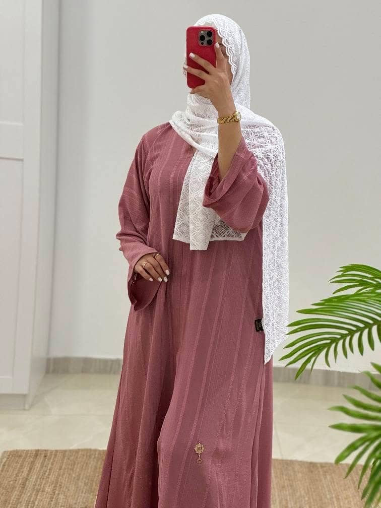Step into timeless elegance with this rose pink abaya, designed with a flowy silhouette for effortless comfort and style. The fabric features delicate vertical stripes that add texture and sophistication, while the wide sleeves enhance its modest and graceful appeal. Perfect for both casual wear and special occasions, this abaya combines simplicity with elegance.