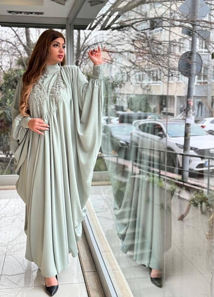 Radiate elegance in this graceful sage green kaftan abaya. Crafted with a free-flowing silhouette, it drapes effortlessly to provide both comfort and sophistication. The front is delicately adorned with intricate embroidery, adding a refined and luxurious touch. Featuring wide batwing sleeves with cuffed button details, this abaya is designed to flatter all body types while maintaining a chic, modest look. Perfect for special occasions, evening gatherings, or refined everyday wear.
